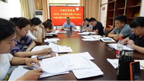 2023年7月18日上午,外语外贸学院于学院会议室召开2023年上半年落实全面从严治党暨党风廉政建设情况分析会,会议由学院党委负责人主持,学院班子成员、科职干部、纪委委员参加。